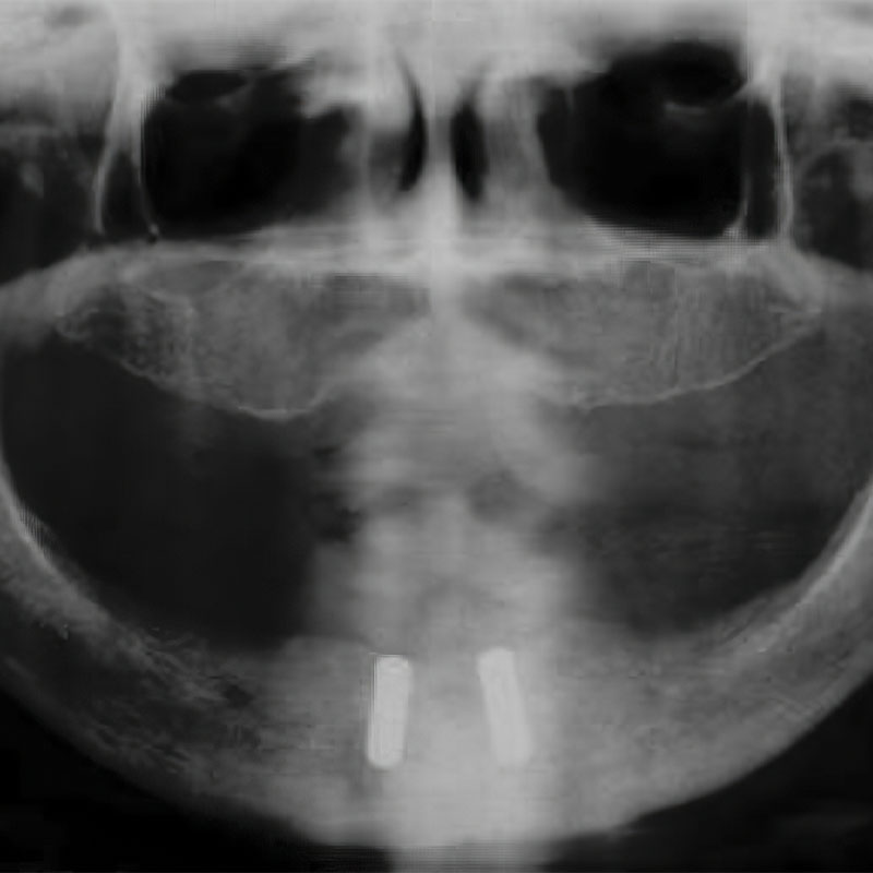 First mandible reconstruction with Osteomesh shaped tray to hold autologous bone grafts. Bony ingrowth and remodeling observed at 2 and 5 months postoperatively.